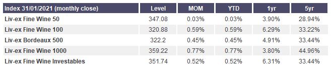 Analizując indeksy win inwestycyjnych okazuje się, że pomimo trudnego 2020 roku spowodowanego koronawiurusem, wino jako aktywo stało się stabilną inwestycją.Indeks Liv-ex Fine Wine 100 , który reprezentuje ruch cenowy 100 najbardziej poszukiwanych szlachetnych win na rynku wtórnym wzrósł w okresie ostanich 12 miesięcy ( dane na 31.01.2021r.) o 6,29%.