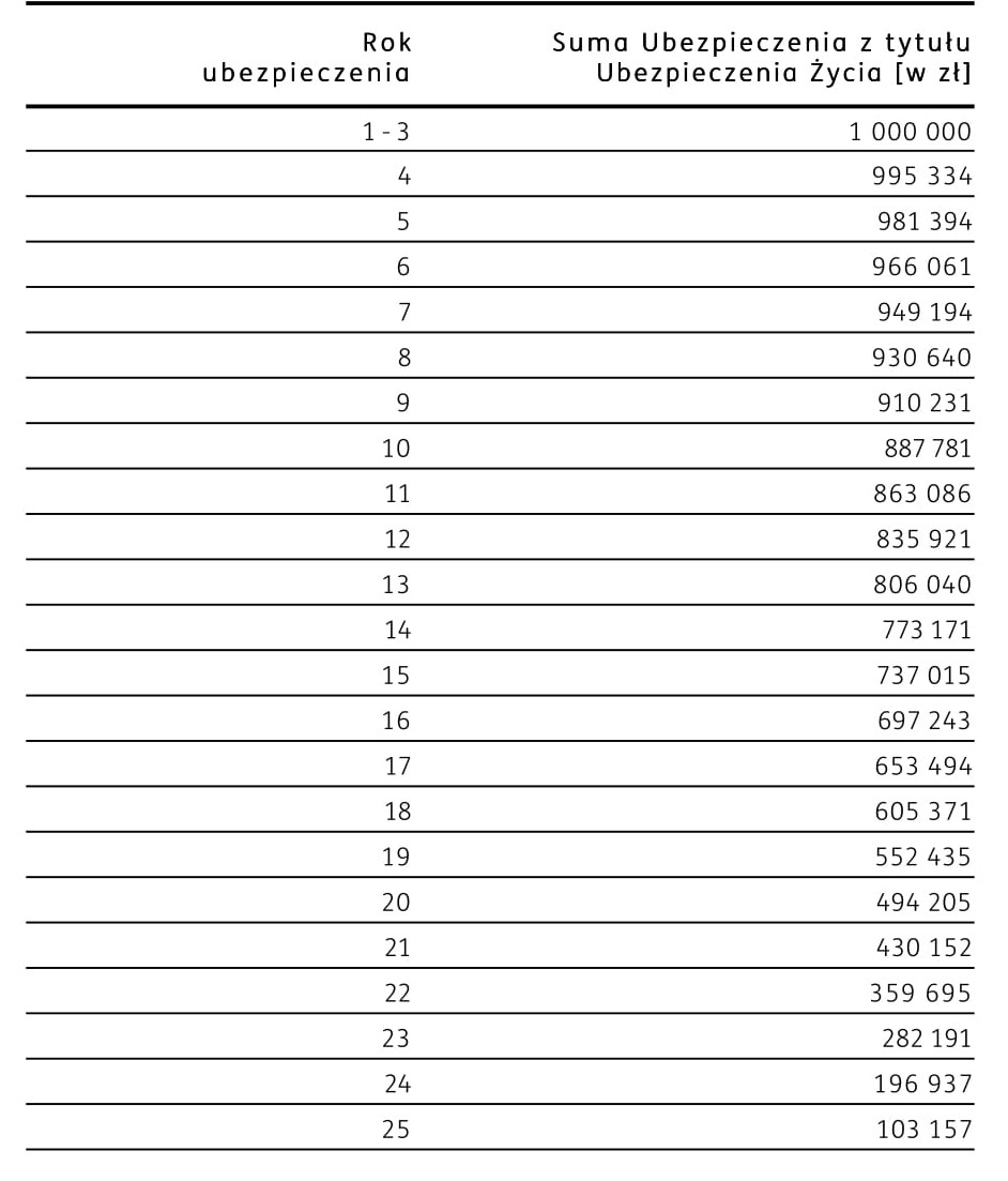 Suma ubezpieczenia w każdym roku trwania umowy maleje zgodnie z poniższą tabelą.