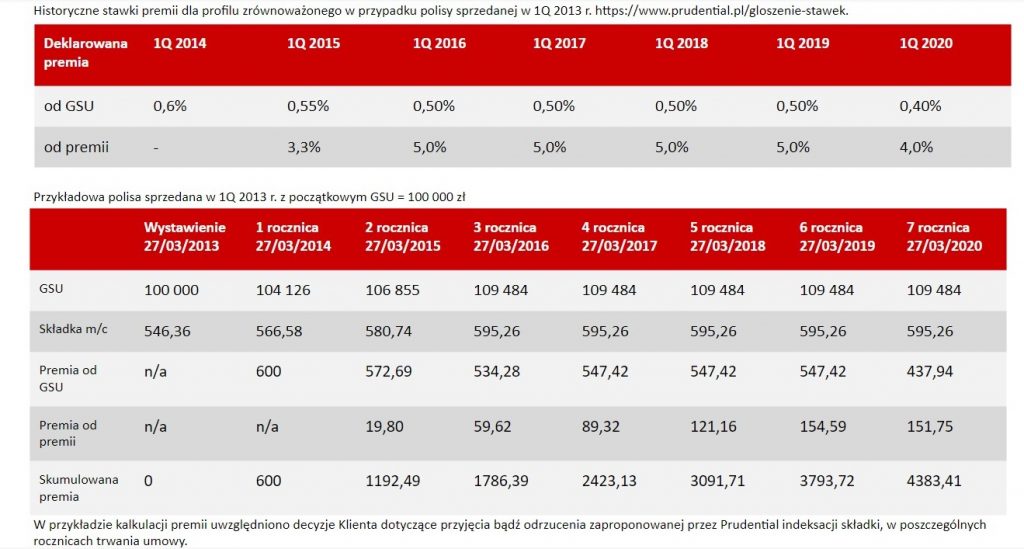 Deklaracja stawek premii rocznej dla wszystkich umów zawartych w danym roku kalendarzowym uwzględnia zarówno oczekiwane w przyszłości stopy zwrotu z lokowanych środków jak i dotychczasowe wyniki osiągnięte z lokowania środków, odzwierciedlone w wartości środków przypisanych do polis zawartych w danym okresie.